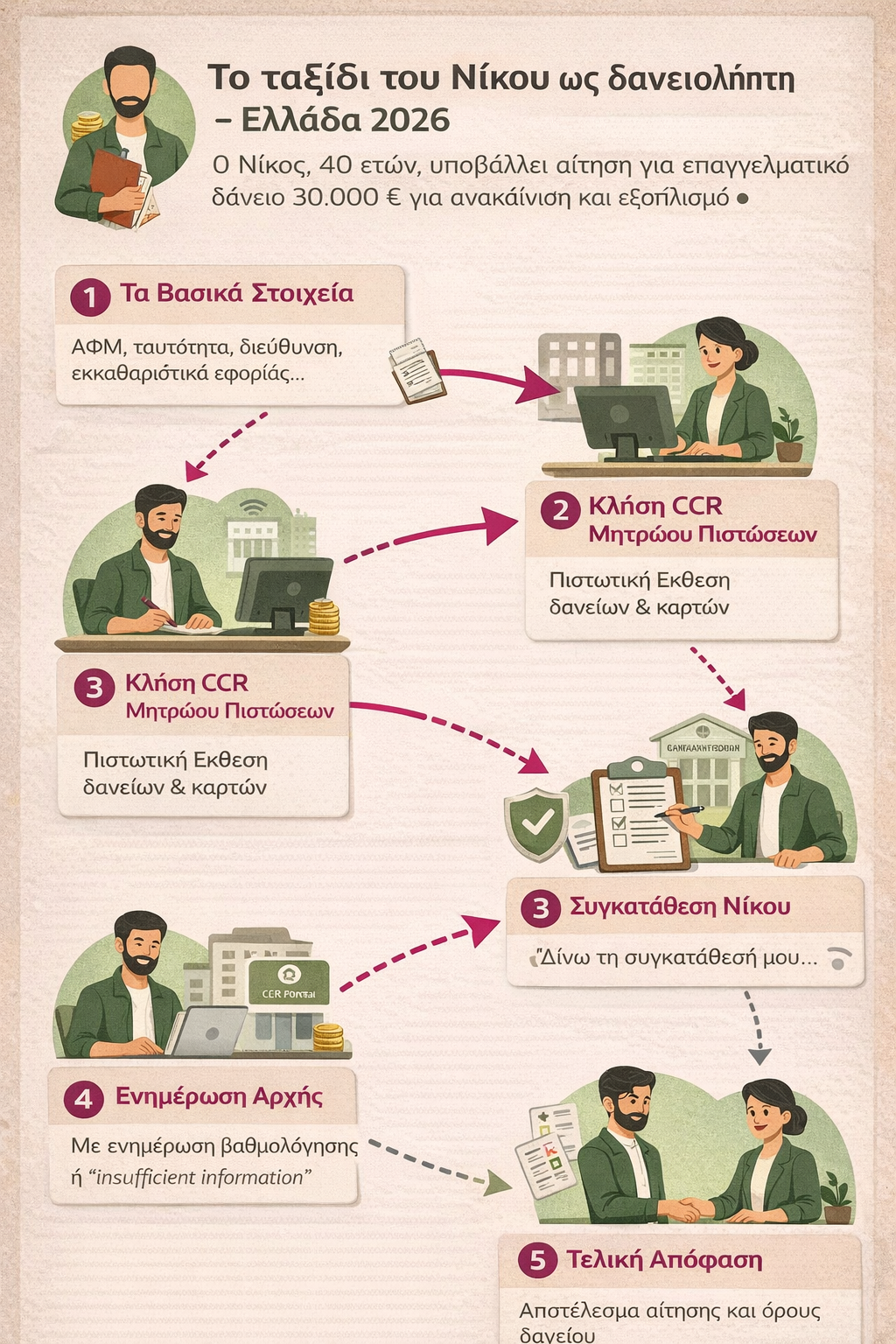 Ας ακολουθήσουμε έναν συγκεκριμένο άνθρωπο, τον Νίκο, 40 ετών, μικρομεσαίο επαγγελματία που θέλει επαγγελματικό δάνειο 30.000 € για ανακαίνιση και εξοπλισμό.