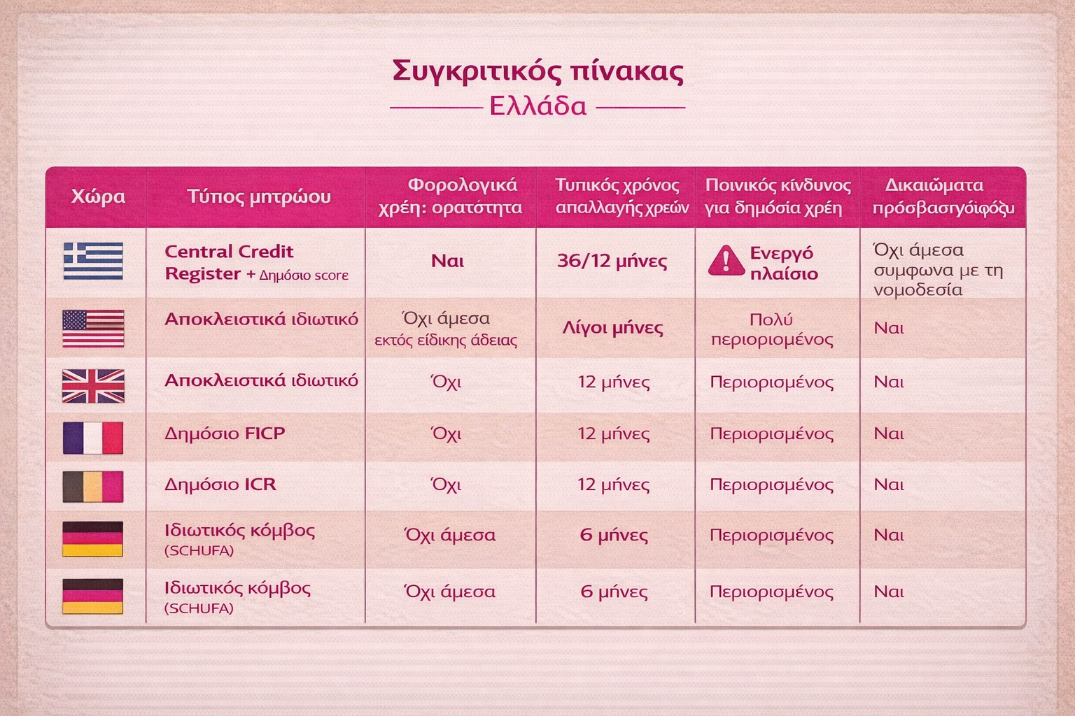 Σύνοψη. Τα συστήματα πιστωτικής πληροφόρησης και τα πλαίσια ατομικής αφερεγγυότητας διαφέρουν έντονα μεταξύ χωρών. Παρακάτω παρουσιάζονται, για κάθε χώρα, το μοντέλο «μητρώου/αγοράς» πιστωτικών δεδομένων, η ορατότητα φορολογικών οφειλών για τους δανειστές, το καθεστώς πρόσβασης και συναίνεσης, καθώς και το πλαίσιο «δεύτερης ευκαιρίας» μέσω πτώχευσης ή ρύθμισης, με τα πρακτικά εμπόδια επανένταξης.