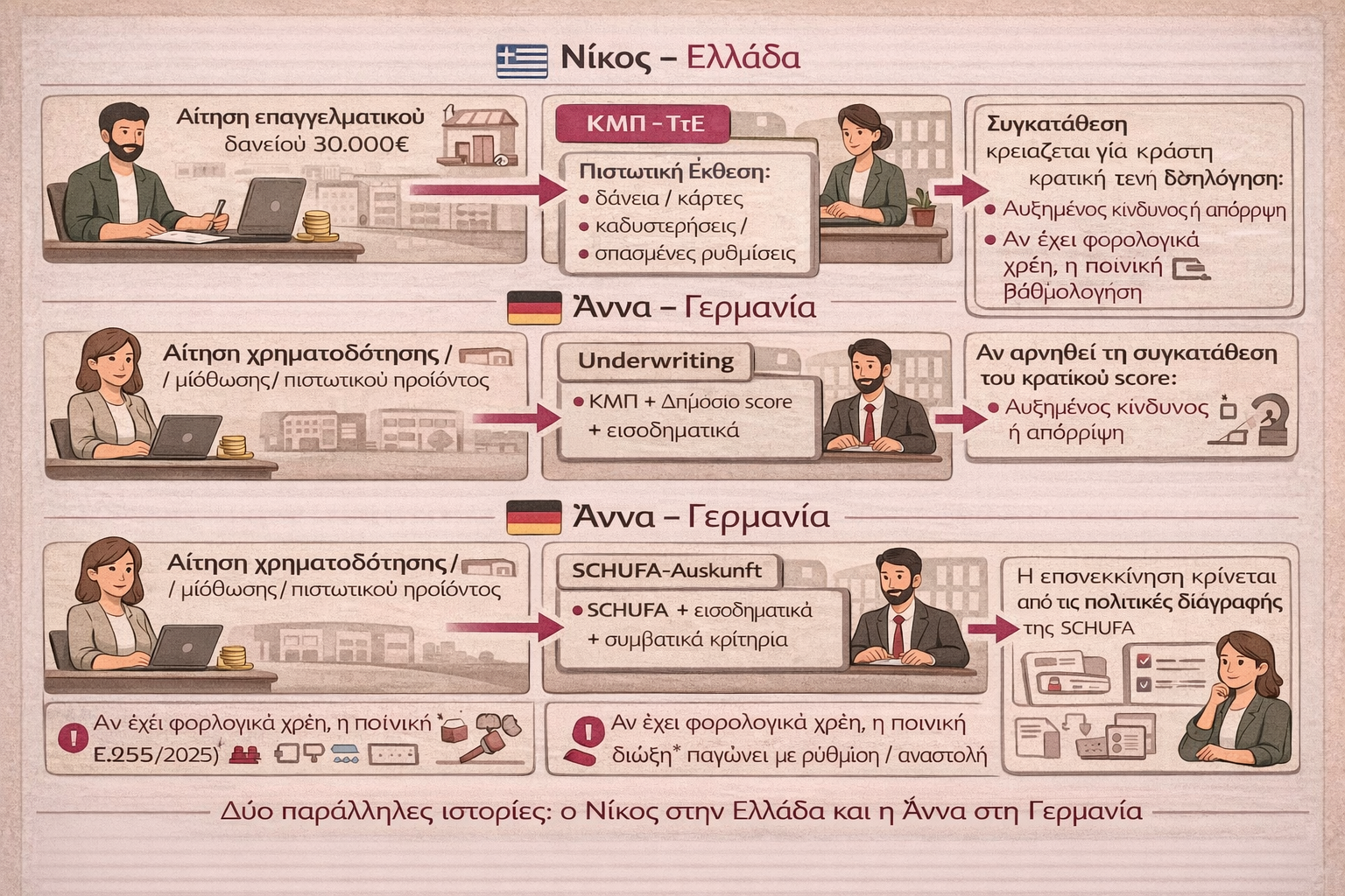 Στην Ελλάδα, η αξιολόγηση τείνει να μετατρέπεται σε ενιαίο φίλτρο που συνδυάζει ιδιωτική πιστωτική ιστορία και κρατική εικόνα συμμόρφωσης. Στη Γερμανία, η αξιολόγηση παραμένει κατά βάση στο πεδίο του private credit history και των συμβατικών/εισοδηματικών κριτηρίων, με τα δημόσια χρέη να μην περνούν ως πλήρης φορολογική εικόνα προς την τράπεζα σε κάθε αίτηση.