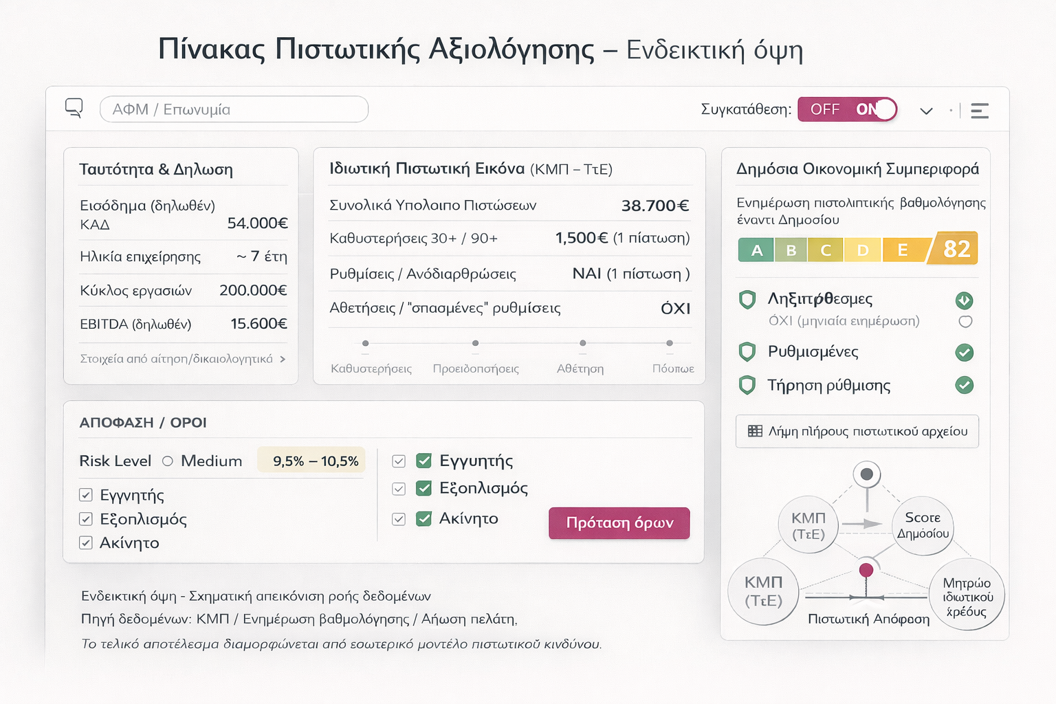 Η τελική απόφαση συνθέτει ΚΜΠ + (αν υπάρχει) κρατική ενημέρωση βαθμολόγησης + εισοδηματικές διασταυρώσεις. Ο Νίκος δεν κρίνεται μόνο ως δανειολήπτης, κρίνεται ως συνολική «οικονομική συμπεριφορά» που ενώνει ιδιωτικό και δημόσιο πεδίο μέσα στο ίδιο underwriting.