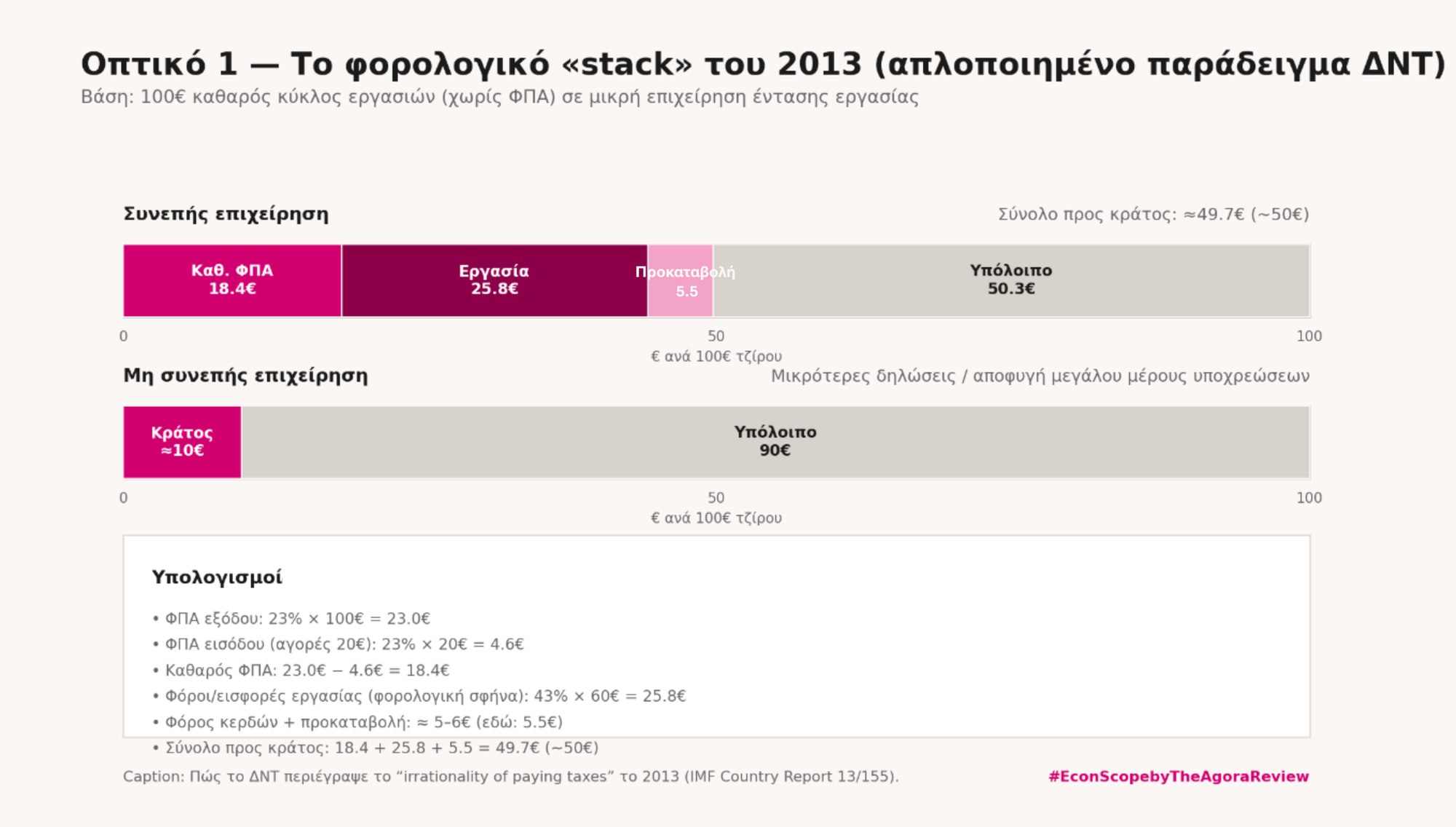 Το 2013, το ΔΝΤ σε επίσημη Έκθεση Χώρας για την Ελλάδα περιέγραψε με έναν ωμό πίνακα ότι για έναν τυπικό μικρομεσαίο επαγγελματία η πλήρης φορολογική συμμόρφωση είναι σχεδόν οικονομικά αυτοκτονική σε αγορά υψηλής παραβατικότητας. Η ίδια χώρα, μετά από χρεοκοπία, PSI και μετακύλιση ρίσκου σε ιδιώτες προμηθευτές, στήνει σήμερα ένα δίκτυο μητρώων και βαθμολογήσεων που ενώνει ιδιωτικό χρέος, χρέος προς το Δημόσιο και τραπεζικό underwriting.