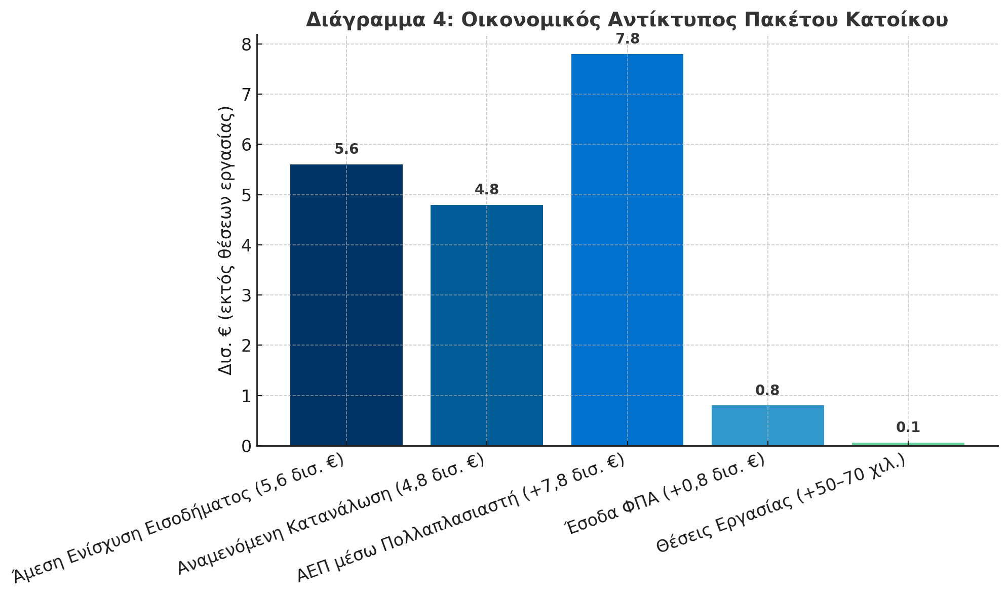 - Έσοδα ΦΠΑ: Αν το 80% πάει σε κατανάλωση και μέσος ΦΠΑ 17% (σταθμισμένος), τότε τα έσοδα αυξάνονται κατά ~0,8 δισ. €.