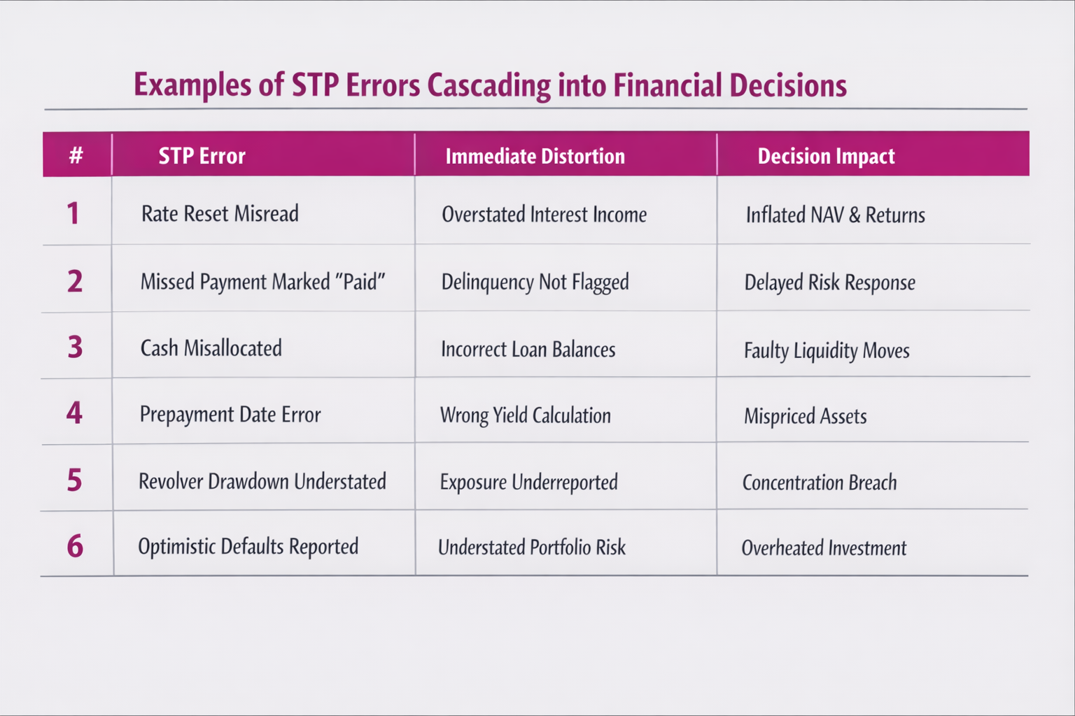 - If those errors are systematically directional (e.g., leverage understated, collateral overstated, covenants logged as a bit tighter than they are), then pools of loans look slightly safer than they are.