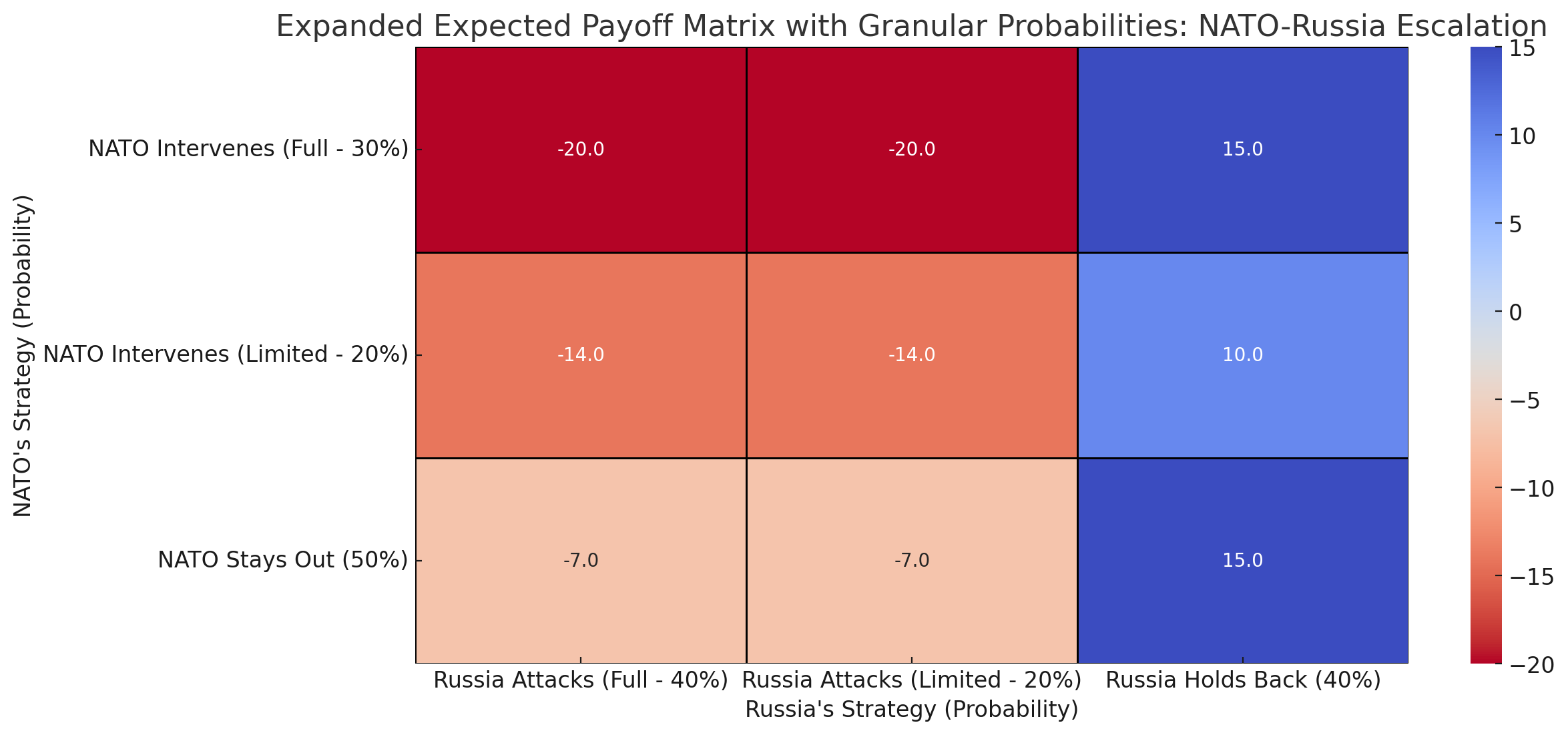 - Worst Outcome (-20 Payoff): NATO fully intervenes, triggering full-scale Russian retaliation.